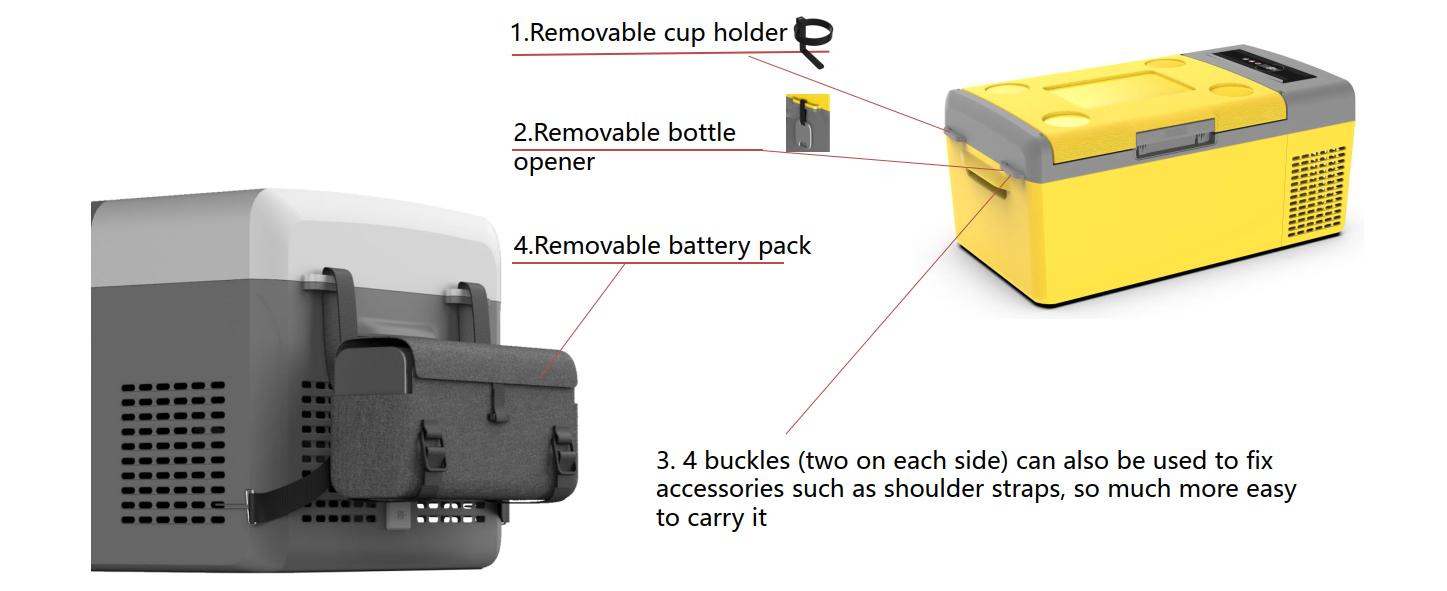 1.Removable cup holder; 2.Removable bottle opener; 3.4 buckles (two on each side) can also be used to fix accessories such as shoulder straps, so much more easy to carry it; 4.Removable battery pack.
